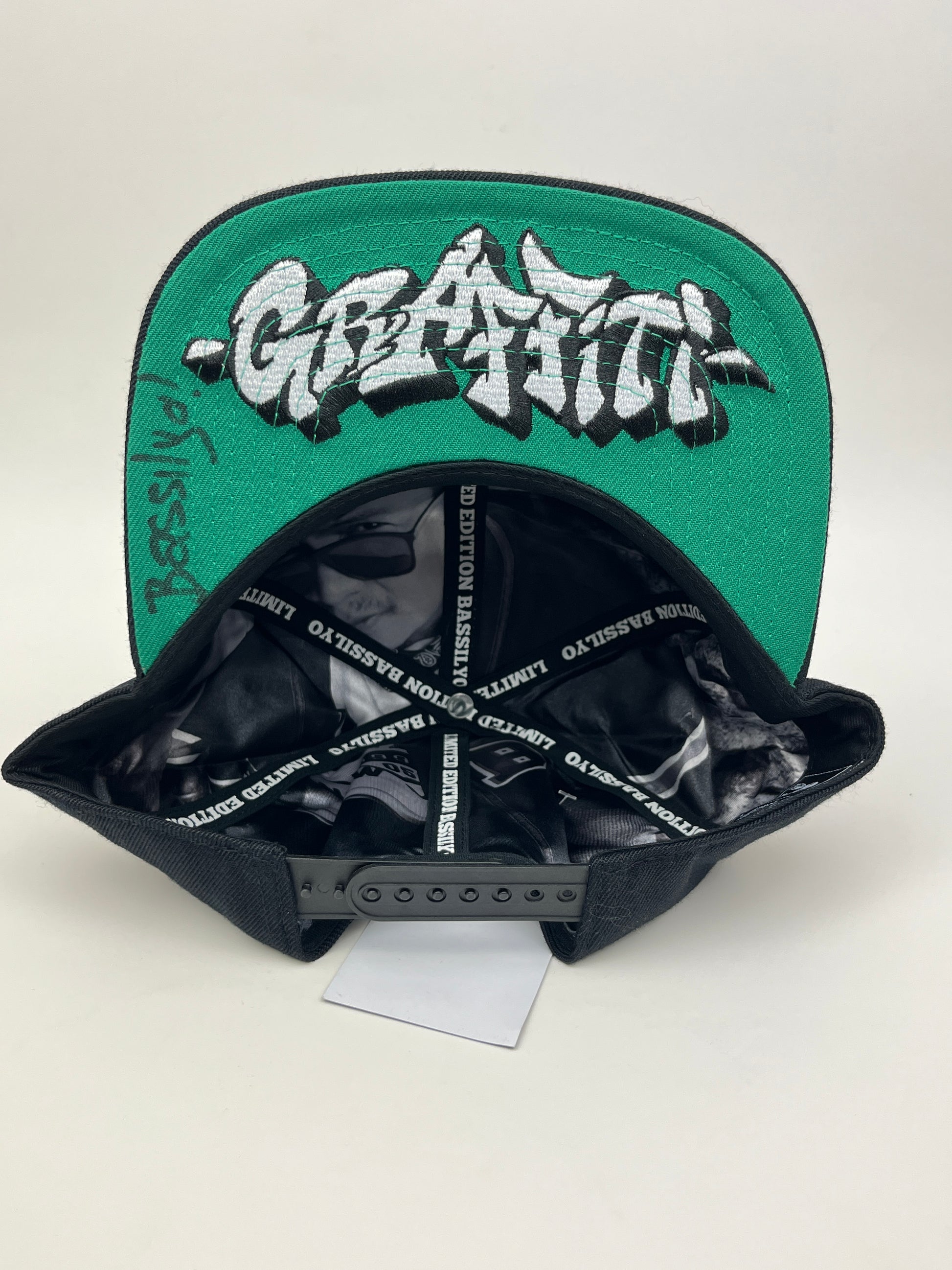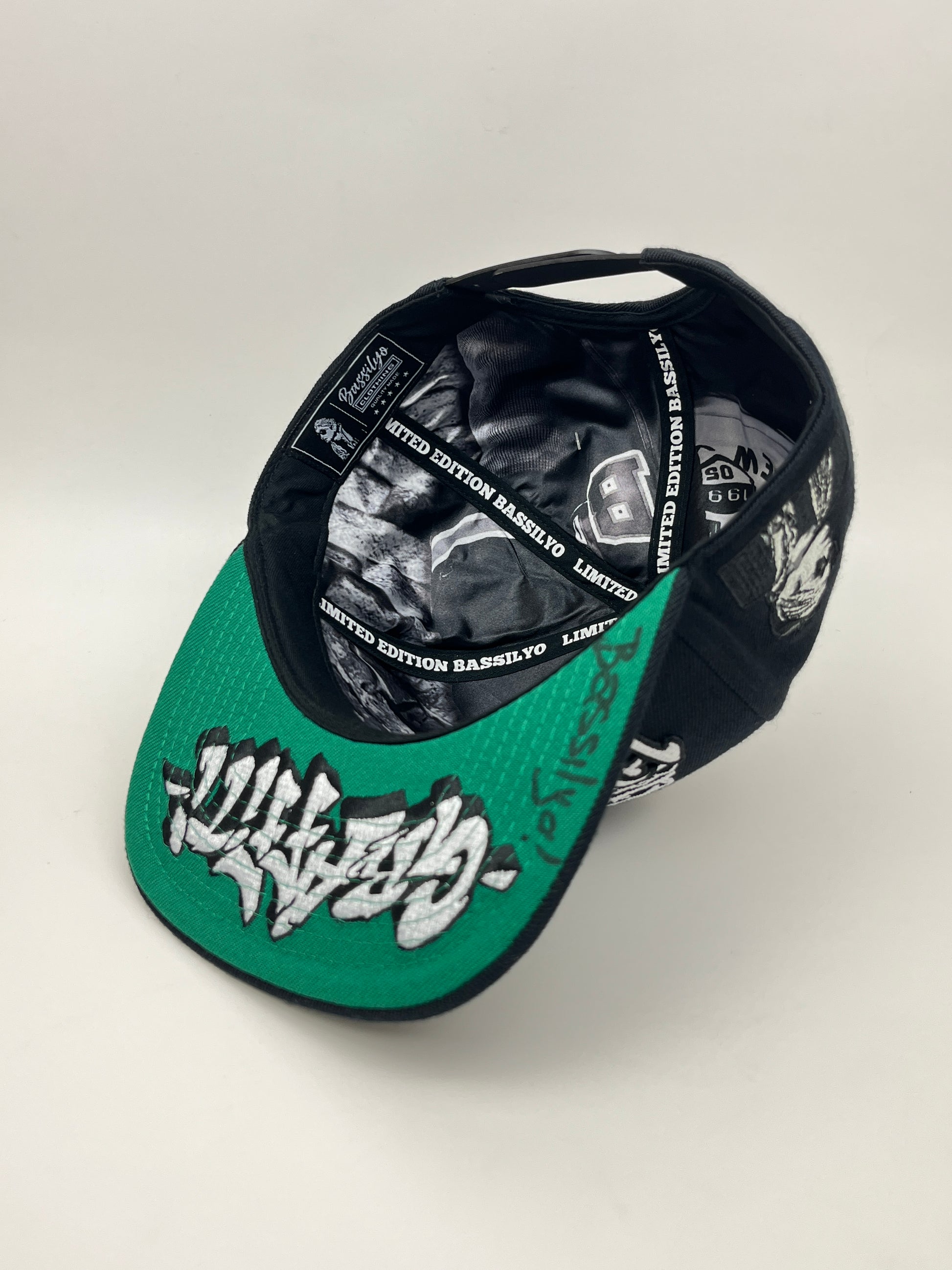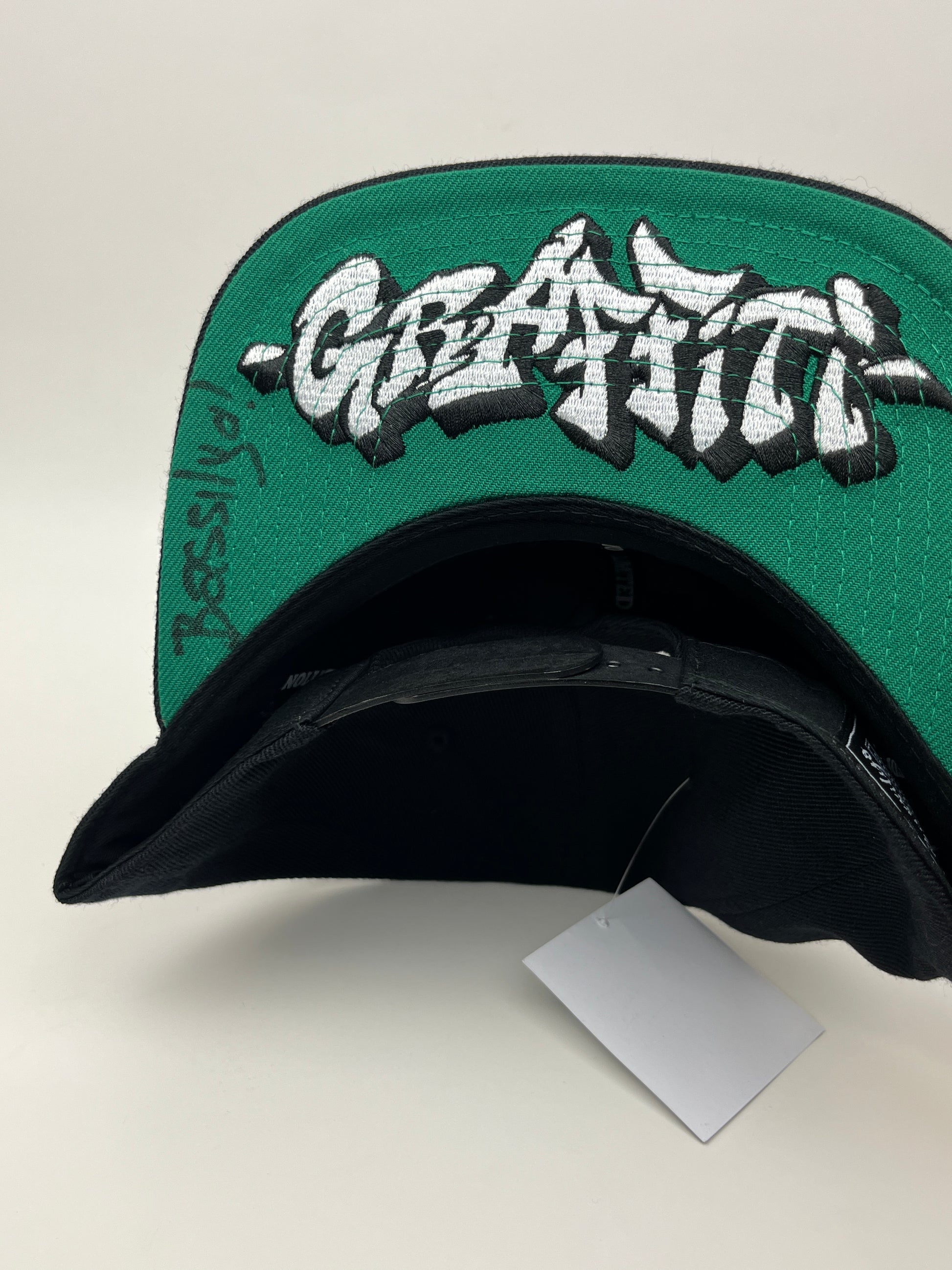 - Green under brim with stylized text and signature detailing