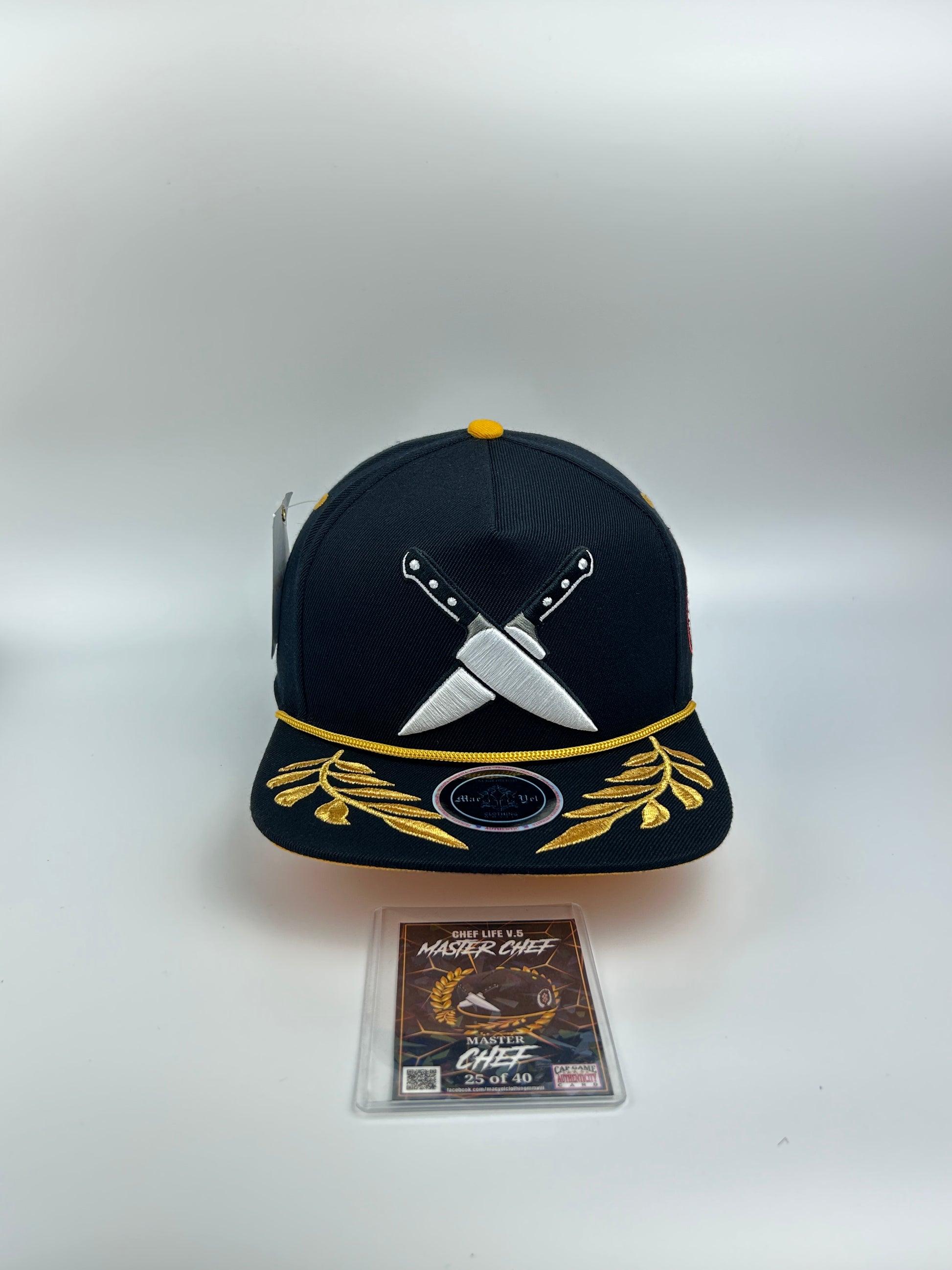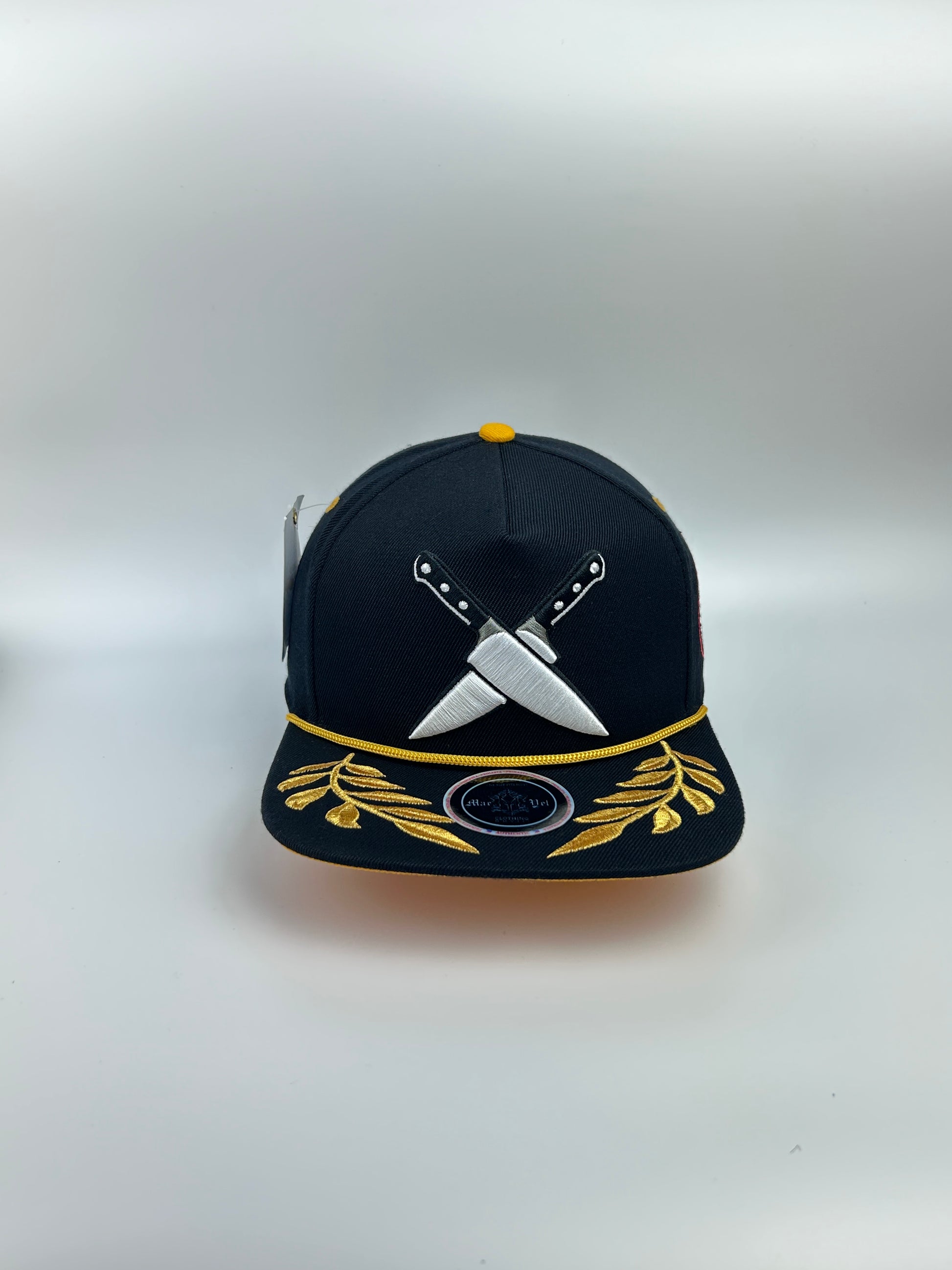 - 🧢 Black Colorway: Sleek black crown with bold embroidery featuring crossed chef knives and golden laurel leaves for that elite chef energy.