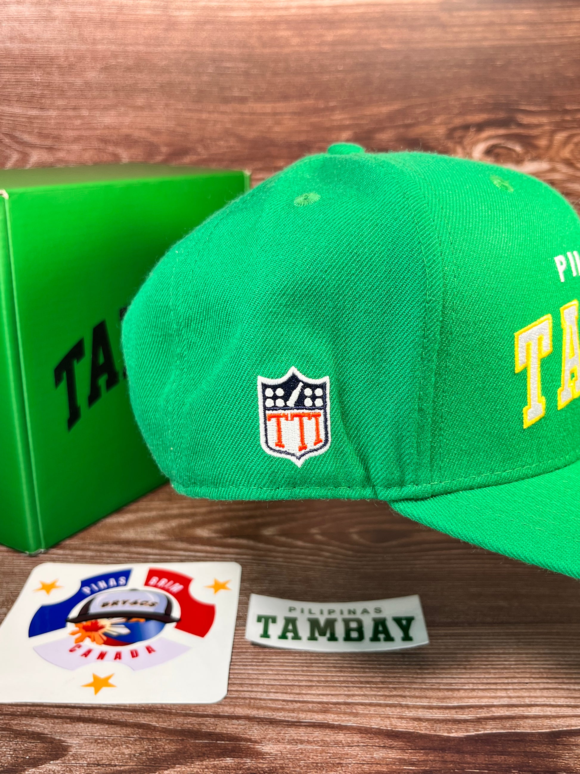 - Signature “PILIPINAS TAMBAY” Cap – Leaf-green with bold yellow embroidery, signed by Pio Balbuena.