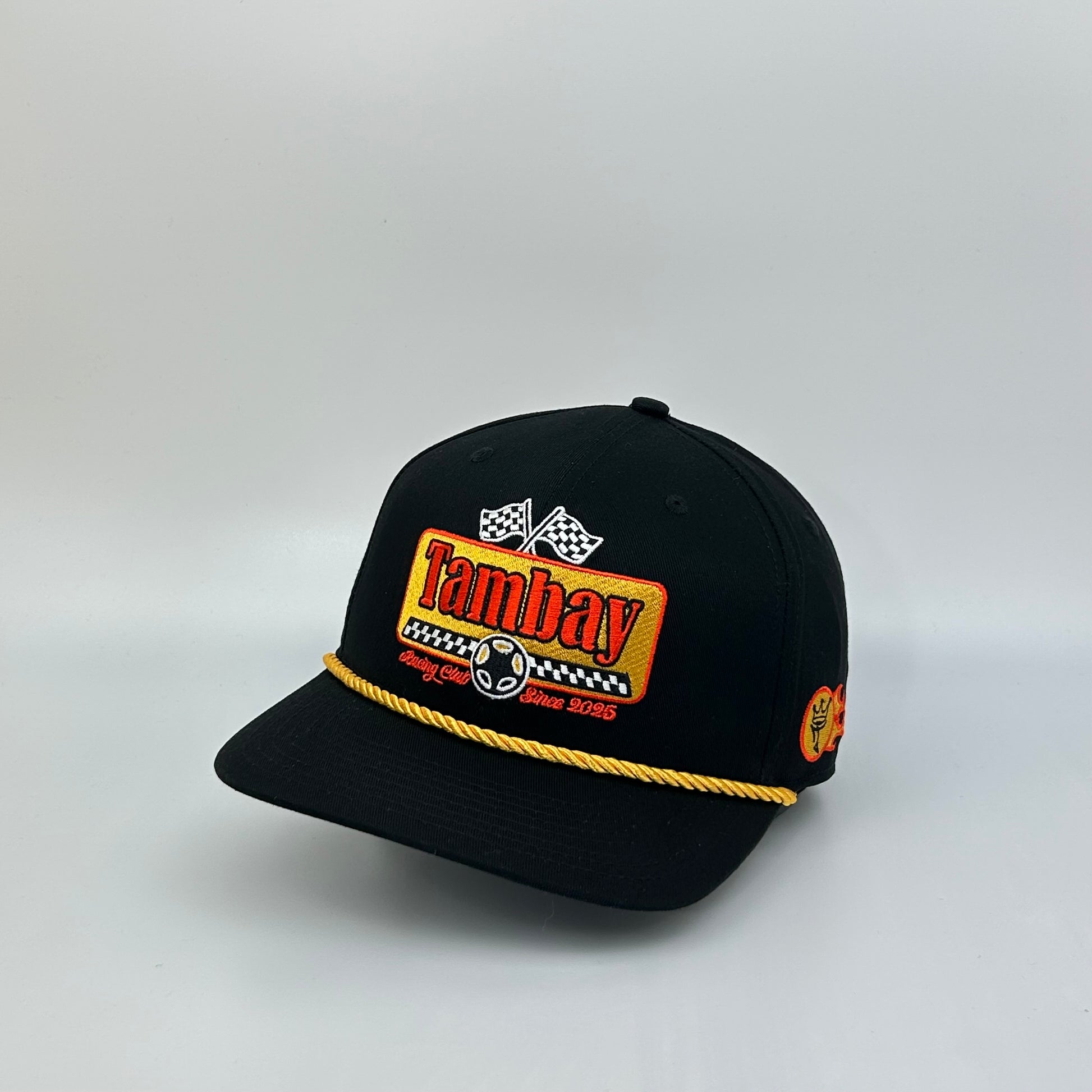 - Structured Crown & Yellow Rope Detail – Classic racing silhouette with bold embroidery: red “Tambay,” checkered flags.